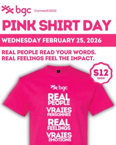 “Real People. Real Feelings” pink shirt available for just $12 at at Baxtrom’s YIG,Giant Tiger in Cornwall, Morrisburg & Alexandria or Foodland Winchester.